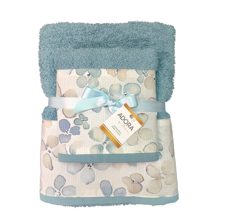 Set asciugamani in spugna azzurra con applicazione di tessuto floreale, composto da 1 Telo Viso + 1 Telo ospite.