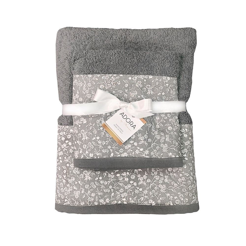 Set asciugamani in spugna grigia con applicazione di tessuto floreale grigio, composto da 1 Telo Viso + 1 Telo ospite.