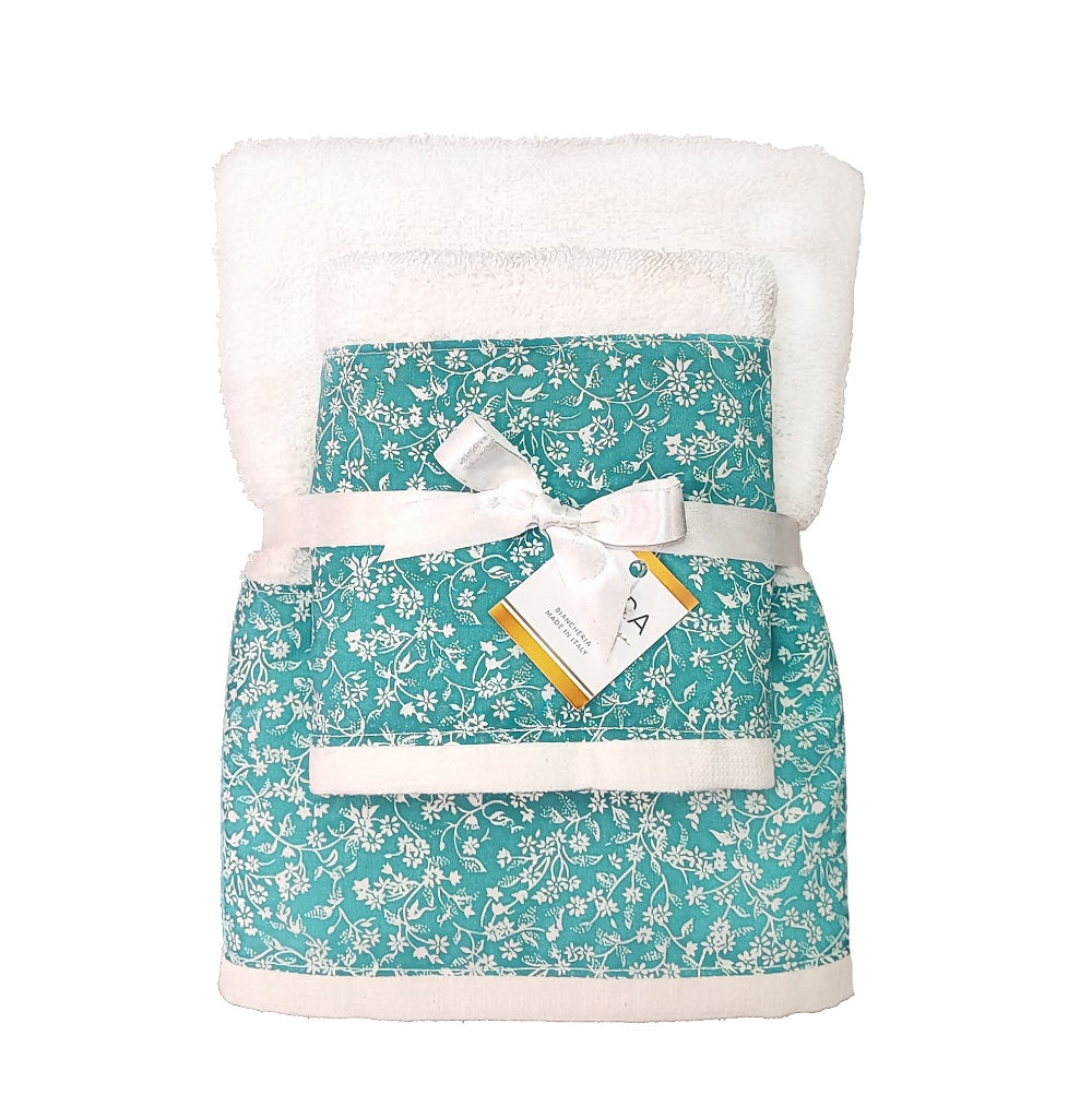 Set asciugamani in spugna bianca con applicazione di tessuto floreale turchese, composto da 1 Telo Viso + 1 Telo ospite.