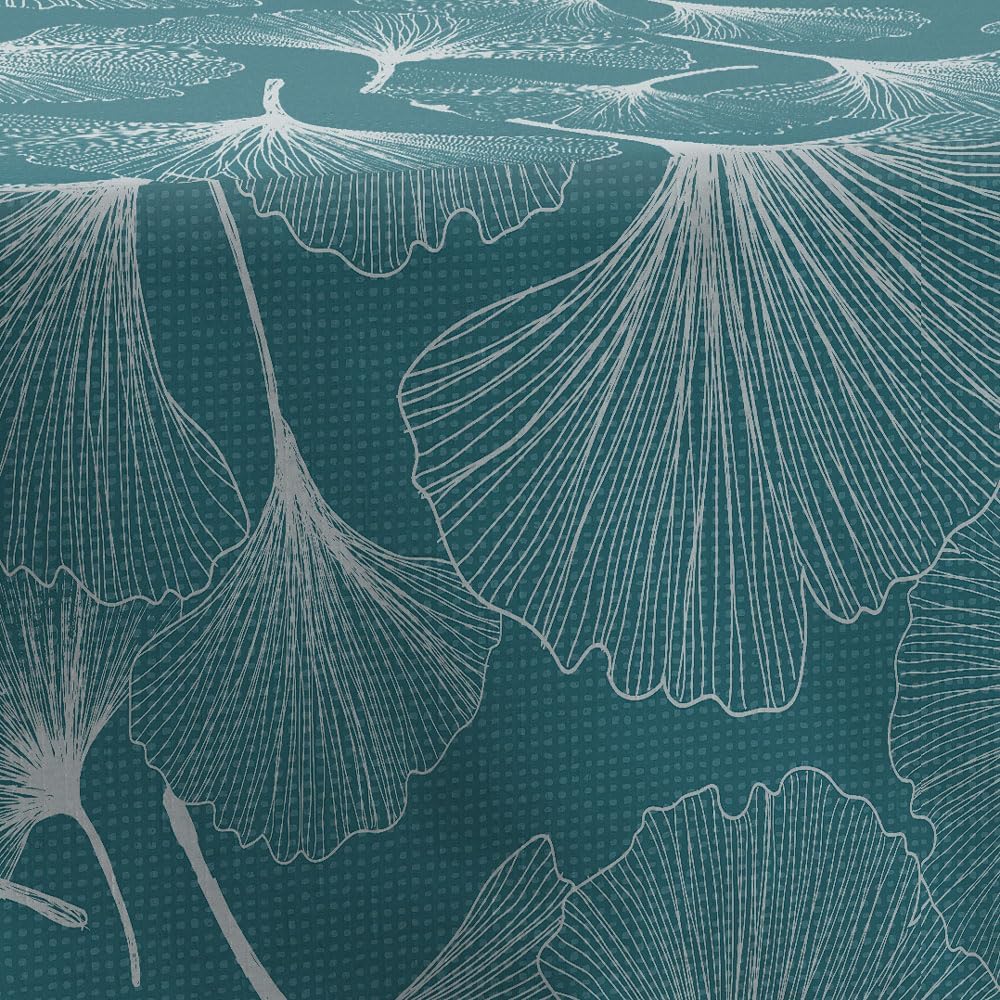 La fantasia Bilboa Vert gioca con linee sottili e foglie di ginko stilizzate in bianco su un fondo verde petrolio intenso, per un effetto visivo elegante, naturale e sofisticato.