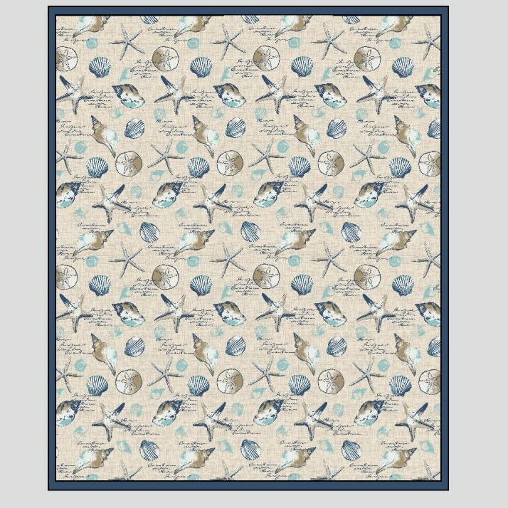Caratterizzata da una base beige come la sabbia, questa tovaglia è adornata con disegni di conchiglie e stelle marine.