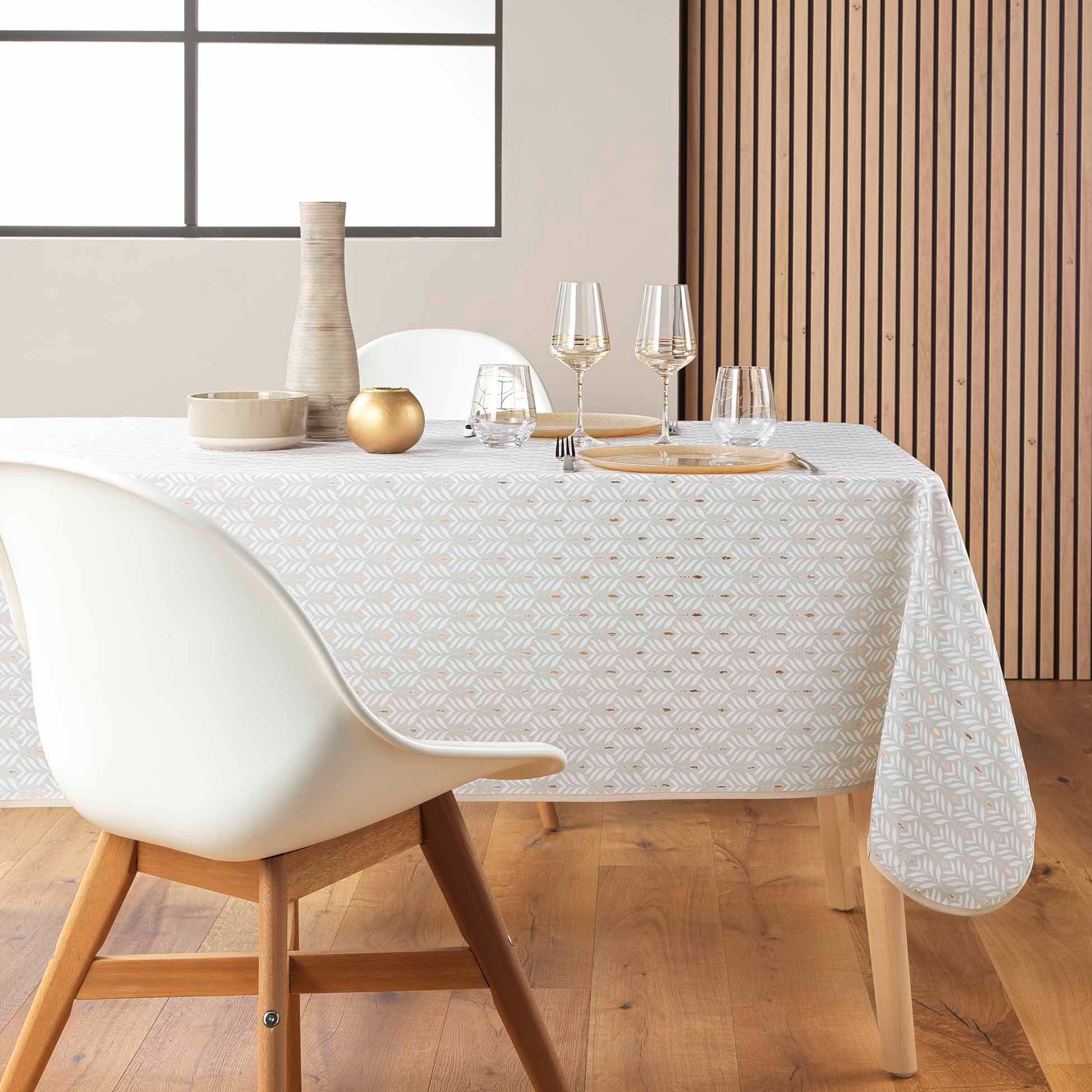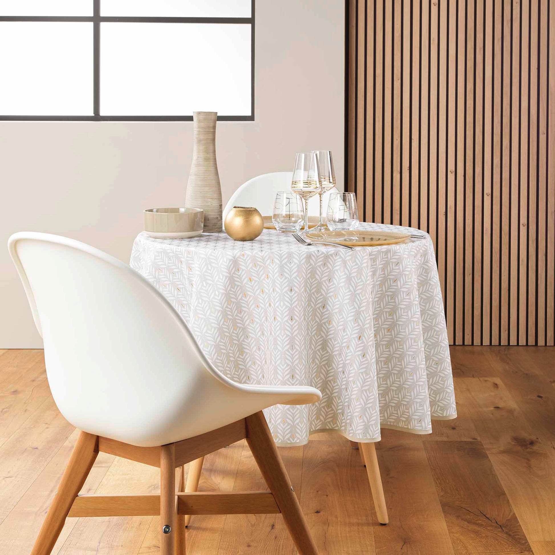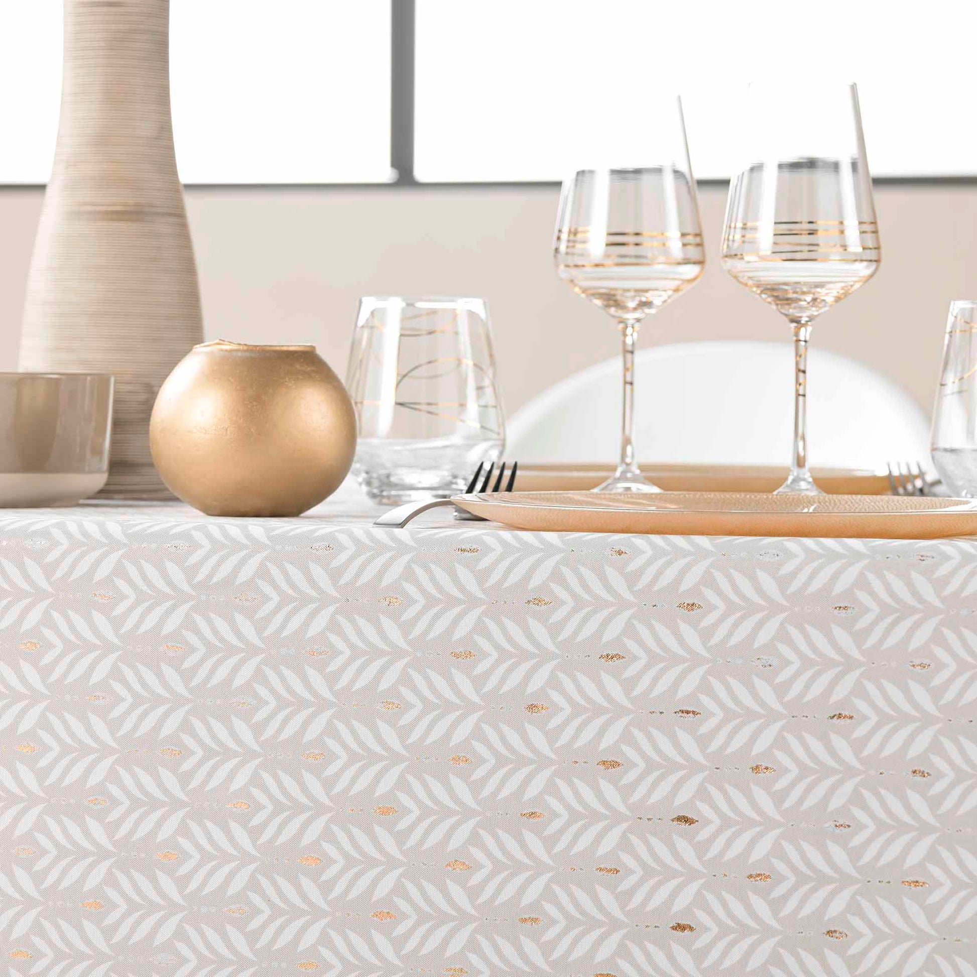 - Design naturale con foglie eleganti e accenti dorati: Il beige caldo, decorato con foglie bianche e dettagli dorati, dona alla tovaglia un aspetto sofisticato e contemporaneo, ideale per una tavola elegante e invitante.