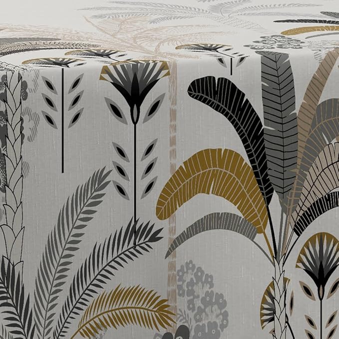 Il design esclusivo presenta un motivo tropicale sofisticato, con palme e foglie stilizzate nei toni neutri del beige, grigio e oro su sfondo chiaro, creando un effetto naturale ed elegante che si adatta a qualsiasi ambiente.