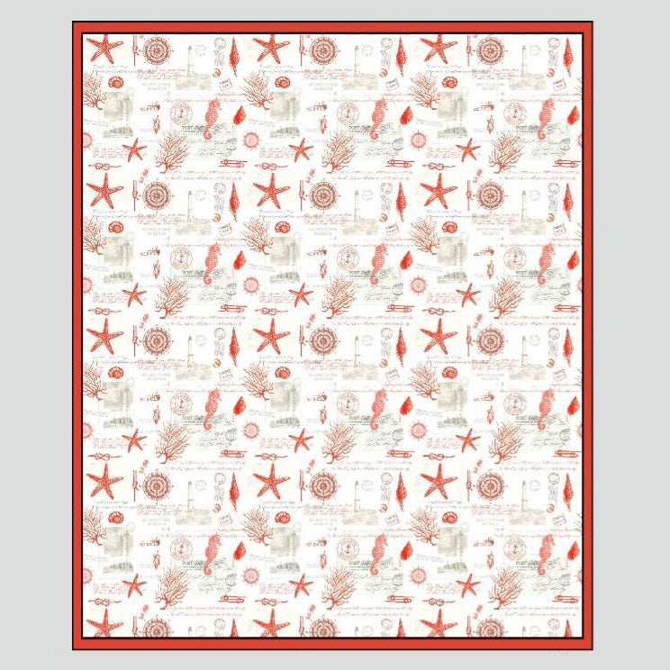 Caratterizzata da una base bianca come la schiuma delle onde, questa tovaglia è adornata con disegni delicati e vivaci di stelle e cavallucci marini in tonalità del rosso corallo.