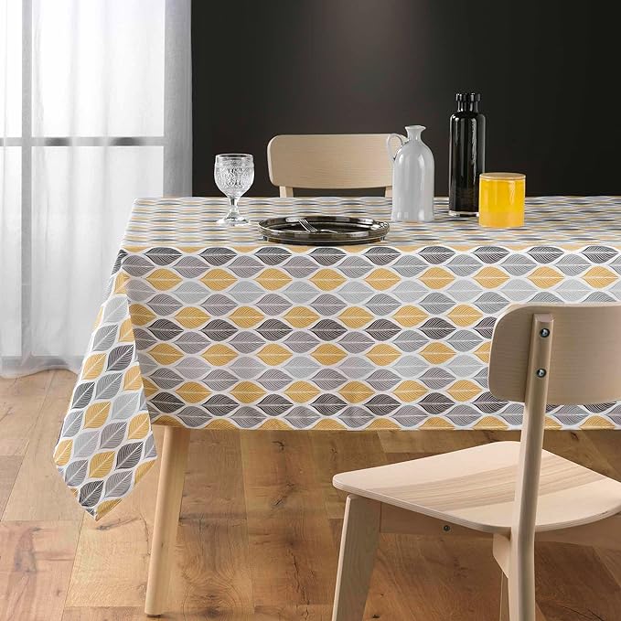 Crea uno Stile etnico-chic con la nostra tovaglia antimacchia con stampa geometrica arricchita da foglie stilizzate nei toni moderni del giallo e del grigio.
