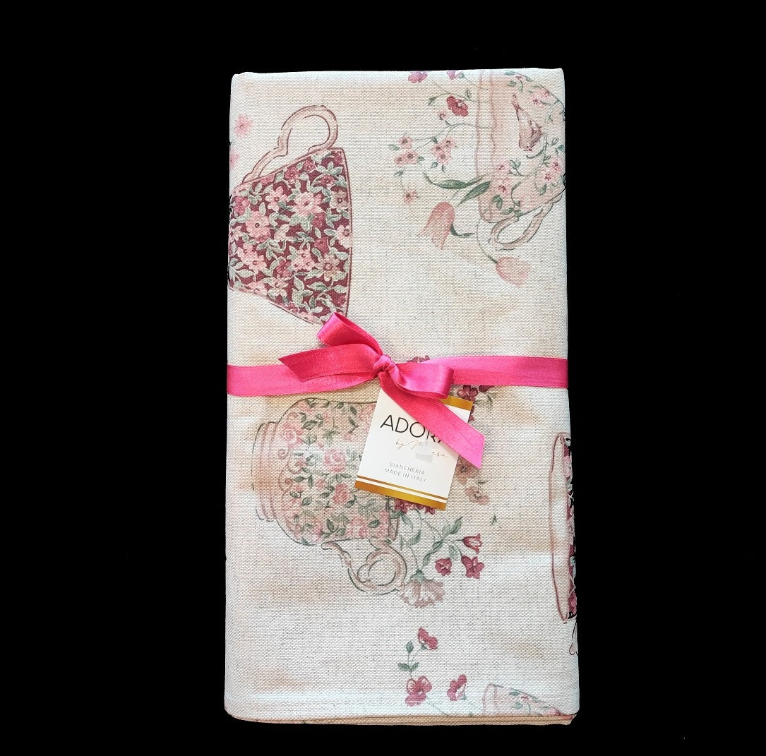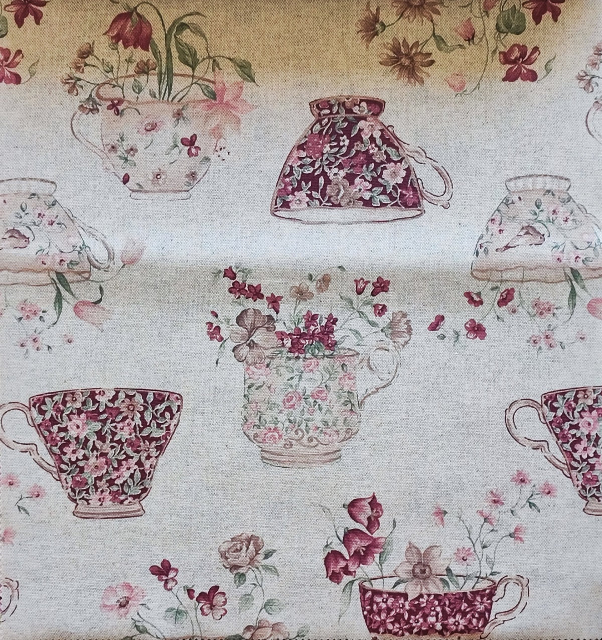 Questa fantasia presenta un raffinato motivo vintage con tazze da tè decorate con delicati fiori in tonalità di rosa, bordeaux e verde, su uno sfondo chiaro effetto lino. Ogni tazza è illustrata con eleganza e arricchita da composizioni floreali che sembrano sbocciare direttamente dalla ceramica, creando un’atmosfera romantica e accogliente.
